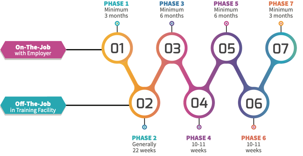 This apprenticeship is deemed to be complete when an apprentice has successfully completed all on-the-job and off-the-job phases of their apprenticeship, which is a minimum of four years in duration from the date of registration.